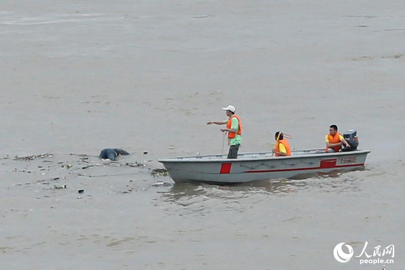 7月16日,2014武汉渡江节现场,有网友@金刚 拍摄到江面浮起一尸体的照片。经初步核实,死者为男性,并非运动员溺亡,属上游漂来,高度腐败。目前,尸体由水上分局打捞起来后,先移交到大桥派出所,后转运到汉口殡仪馆。牛牛/CFP