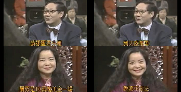 这个时期的邓丽君歌曲,从民间的角度看是解禁了,市面上可以买到她的磁带、录像带、宣传画等产品了;而从官方的角度,邓丽君还是禁区。在她的有生之年,中央电视台从未正面报道过她。“官冷民热”的态势依旧持续着。
