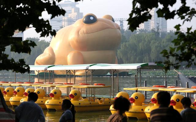 法制晚报讯(记者 白冰 马晓晴) 近日,玉渊潭公园湖面上出现的一只巨大的充气金蟾遭到网友吐槽,称模样雷人没有美感。对此,金蟾的设计者表示,它的设计灵感来自蟾蜍的吉祥寓意,自己只是传递一个文化理念,至于大家的评判“我是不能左右的”。