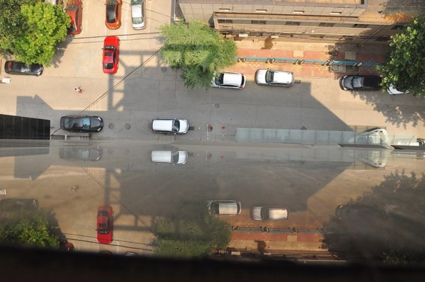 一辆黑色汽车的右侧被砸扁,再抬头一看,20毫米厚的玻璃破碎,支撑玻璃的铁架子被砸的七零八散,他赶紧叫了急救人员,急救人员赶到现场一看,该男子已经气绝身亡。图为现场。