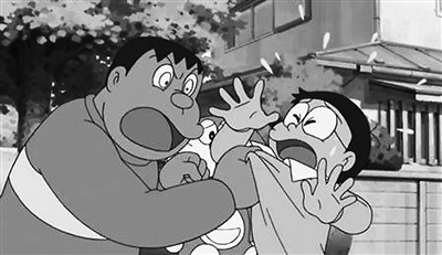 在这部动漫中,一个常见的情节就是主角之一大雄经常受到胖虎的欺负,然后找哆啦A梦帮忙(上图)。据台湾“东森新闻网”报道,有家长和教师认为,这样的情节会助长校园暴力,“不是一部适合儿童长年观看的卡通”,要求台湾华视立即“自律下架”。