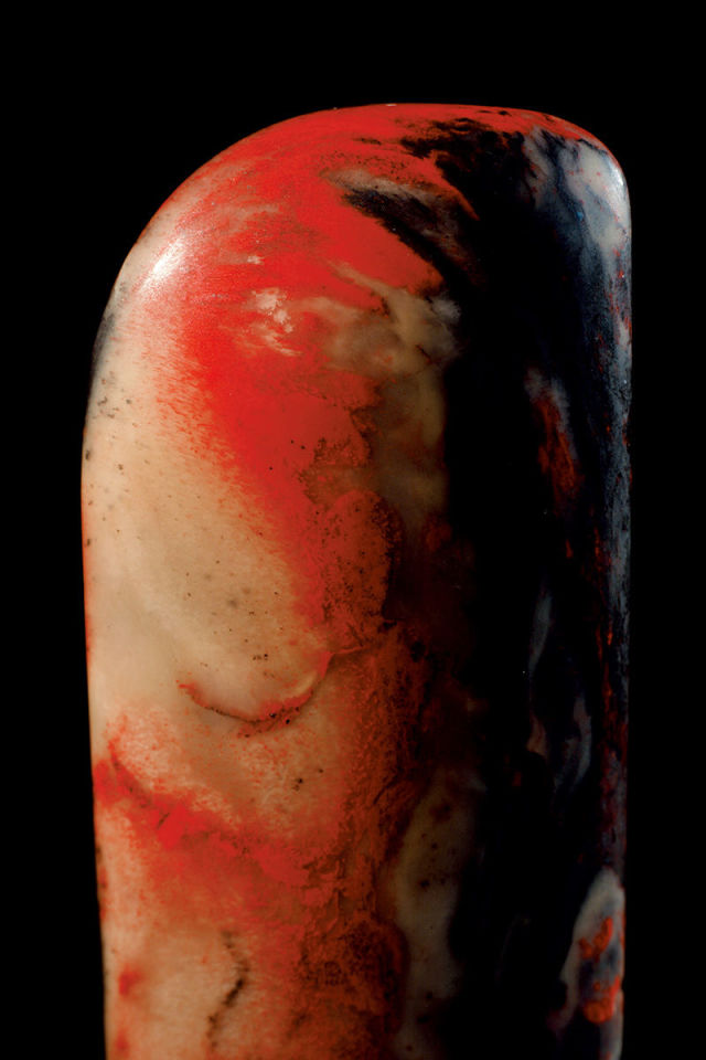 王文甫藏有一枚昌化鸡血的极品“刘关张”,虽然鸡血以大红袍最为著名,“刘关张”却是最为传神和珍贵的,因为红、白、黑三种石色合于一石,三色分别对应关羽、刘备和张飞,因称“刘关张”。在很多金石爱好者的眼里,“刘关张”是只存在于传说中的石材。印文为:聚石楼。齐白石为陆质雅刻于一九三三年。或许是爱惜难得的石材,齐白石只以时间和名字作为边款。“聚石楼”也是王文甫曾经用的号。