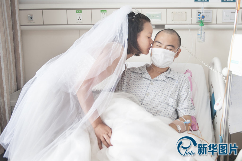 中南大学湘雅医院,向华穿着婚纱出现在男友李真的床边,深情一吻。李真被确诊患白血病后,最大的愿望就是看见向华穿着婚纱出现在自己面前。