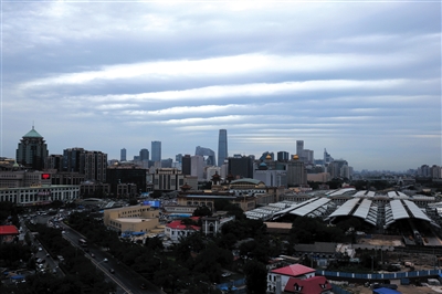 昨日,北京站附近的上空出现了少见的带状云。(高志星摄)