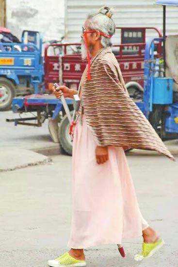 这是9点38分,“犀利爷爷”依旧是一身招牌打扮:发髻,墨镜,粉色长裙,手拿木棍。