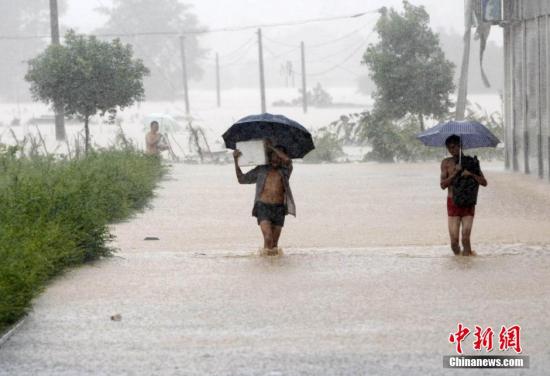 7月24日,江西德安县城,行人在受淹的街道上行走。受台风“麦德姆”外围影响,江西局部降下史上最强降雨,该省多地因突发洪水县城受淹。截至目前,台风引发的暴雨已致赣逾10万人受灾,一人遇难,两名女童失踪。中新社发 顾伟东 摄