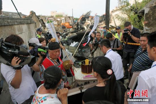 7月24日,台湾澎湖空难罹难者家属陆续到湖西乡西溪村失事现场,以当地风俗为亡者举行招魂仪式。台湾复兴航空一家客机23日傍晚从高雄飞澎湖马公机场时,重飞失败而在当地失事,造成机上58位乘客和机组人员目前有48人死10人伤。 中新社发 黄少华 摄