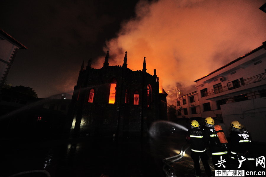 2014年7月28日,浙江宁波市江北区中马路2号的宁波老外滩天主教堂发生火灾。消防员在紧张灭火