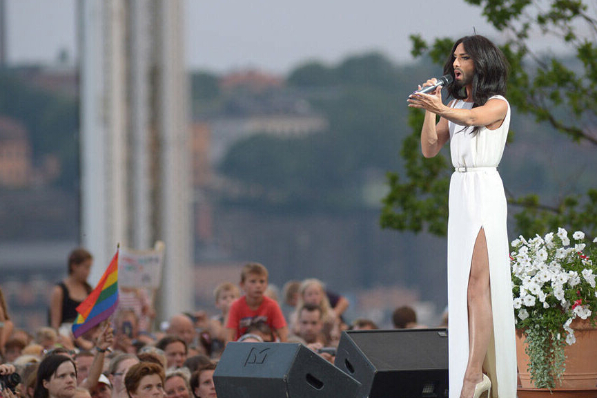 大胡子歌手身穿白色高开叉裙演出秀妖娆身材