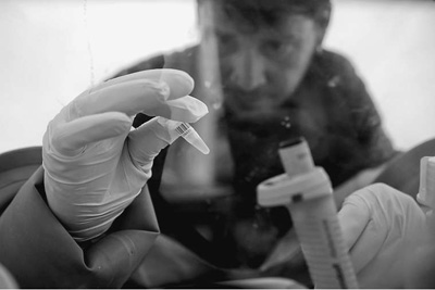 几内亚盖凯杜一名科研人员手持埃博拉病毒样本进行检测。