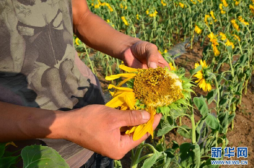 7月31日,一位农民在展示已经枯萎的向日葵。记者日前在内蒙古自治区乌兰察布市察哈尔右翼前旗采访发现,由于内蒙古部分地区持续干旱,造成当地大面积种植的向日葵面临减产甚至绝收的危险。据了解,旱灾已造成内蒙古地区416千公顷农作物受灾,其中农作物成灾面积213千公顷,农作物绝收面积27千公顷;草场受灾面积1950万公顷。新华社发(连振摄)