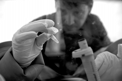 2014年4月3日,在几内亚盖凯杜,一名科研人员手持埃博拉病毒样本进行检测。新华社发