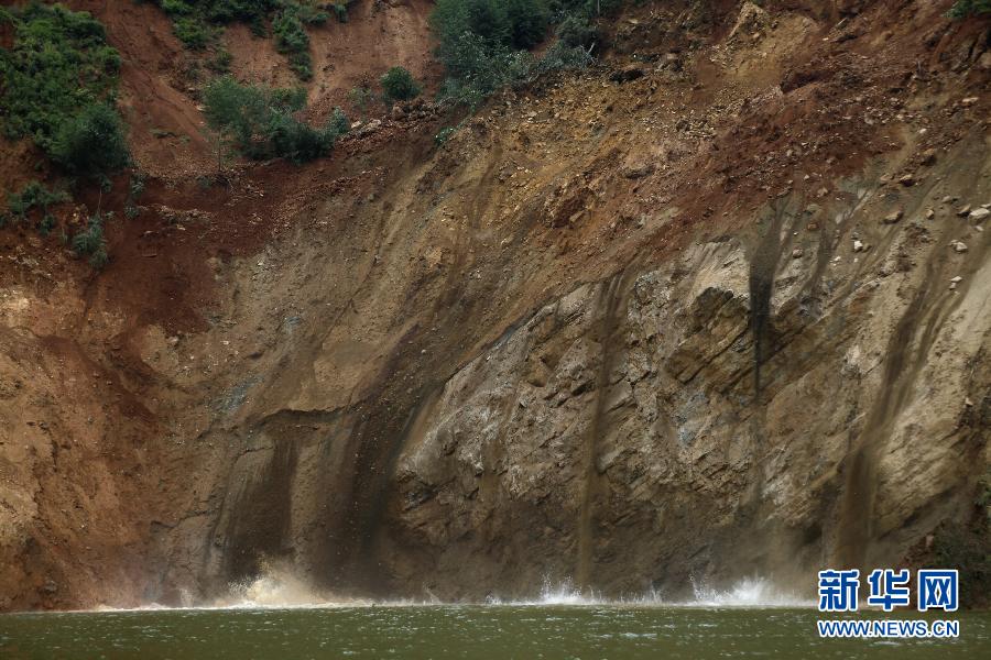 堰塞湖内两部分山体仍在塌方(8月6日摄)。