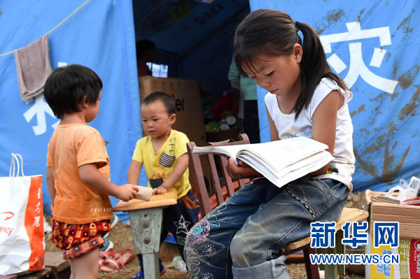 9岁的罗红霞(右)在鲁甸地震重灾区龙头山镇安置点的帐篷前看书学习(8月6日摄)。新华社记者蔺以光摄