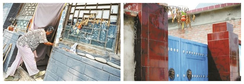 门前的装饰显示两个村庄风俗相近但居住条件却拉开了距离