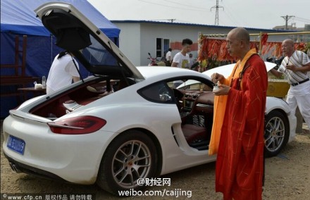 财经网【湖北孝感寺庙法师为保时捷跑车开光】2014年8月6日,湖北孝感云梦县心虔寺(原云台山寺)举行冥阳两利水陆大法会,法师为一辆保时捷跑车开光,祈福人车平安吉祥。