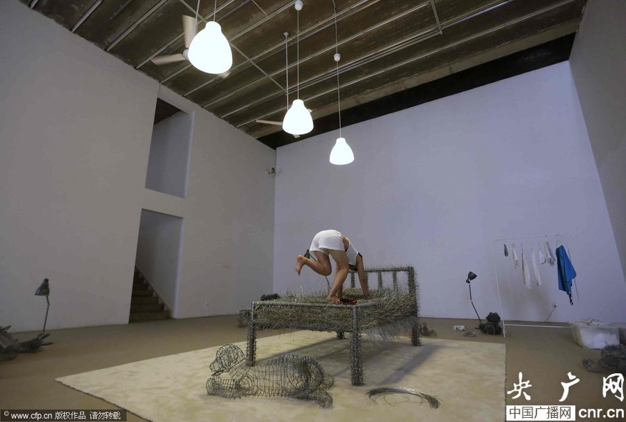 2014年8月11日,北京,中国女艺术家周洁在北京现在画廊的展厅睡在一个未完成的铁丝床上,这一艺术项目被命名为“36天”,而这36天里,她可以正常进食、洗漱、如厕,以及玩手机等。