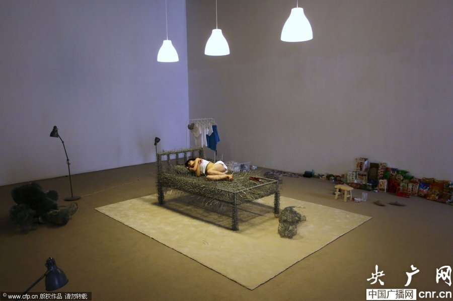 据了解,从8月9号到9月13号,周洁将在北京现在画廊的展厅里睡在铁丝床上。一张未完成铁丝扎成的单人床、一堆铁丝编织的“毛绒玩具”半成品,维持一个多月的食物、手机等等,周洁将与这些东西为伴生活36天。