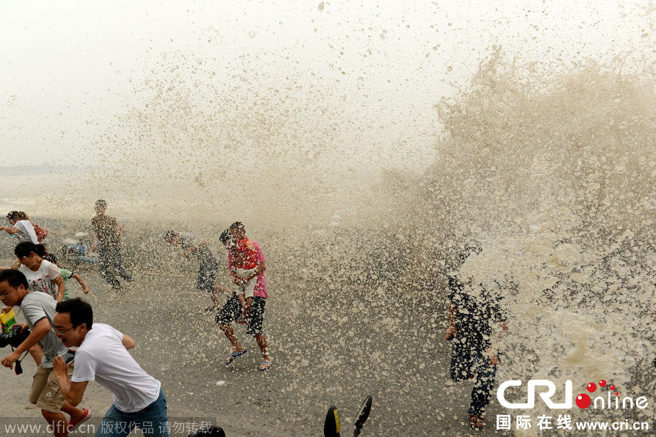 2014年8月11日,农历七月十六,钱江潮水在杭州下沙江堤掀起巨浪,瞬间打湿了观潮者。受“超级月亮”影响,这两天的钱江潮壮观程度堪比往年八月十八潮。图片来源:东方IC