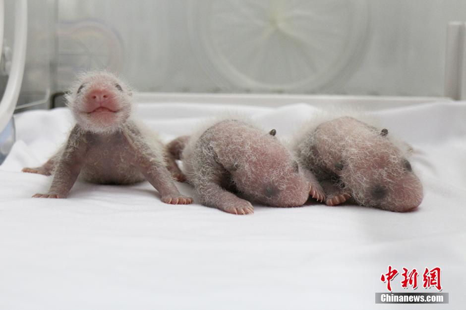 8月12日记者从中国保护大熊猫研究中心获悉,卧龙大熊猫“菊笑”于7月29日凌晨在广州长隆野生动物世界顺利产下三胞胎熊猫宝宝。这是迄今为止中国?;ご笮苊ㄑ芯恐行拇笮苊ǖ诙尾氯?,也是圈养大熊猫人工繁育史上有记载的第四个三胞胎,目前母子情况基本稳定。记者 安源 大熊猫研究中心供图