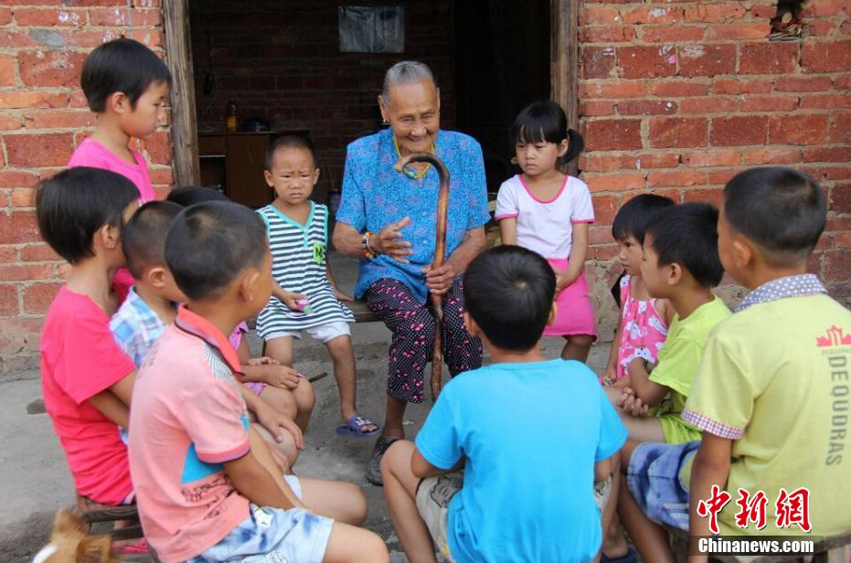 在湖南永州市宁远县天堂镇岭脚村,有一位“特殊人物”。每当人们提及她,村民便会如是介绍:“她杀过很多鬼子”。这位传奇人物便是105岁抗战女兵严金花。图为严金花给村里的留守儿童讲述自己的抗日故事。何红福 摄