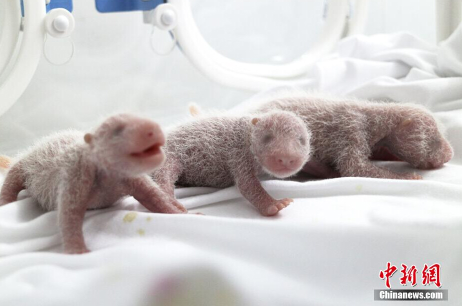 8月12日记者从中国?;ご笮苊ㄑ芯恐行幕裣?,卧龙大熊猫“菊笑”于7月29日凌晨在广州长隆野生动物世界顺利产下三胞胎熊猫宝宝。这是迄今为止中国保护大熊猫研究中心大熊猫第二次产下三胞胎,也是圈养大熊猫人工繁育史上有记载的第四个三胞胎,目前母子情况基本稳定。记者 安源 大熊猫研究中心供图