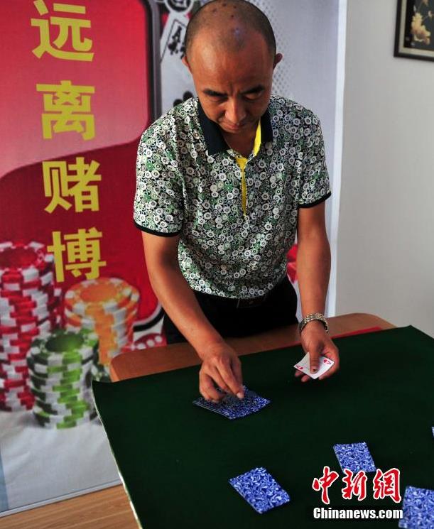 8月12日,龙祥在他的反赌工作室,逐一演示赌场中最常见的几种“千术”。龙祥,来自天津,曾为赚钱出入赌场十多年;在他了解了赌场中的许多内情,看到赌桌上的种种“千术”后,如今他大转身份,在石家庄成立一家反赌工作室,成为一名反赌人士。并决心通过自身的经历,揭秘赌场上的千术,帮助那些沉迷赌博的人悬崖勒马,戒除赌瘾。据其介绍,反赌工作室已成功帮助来自北京、山西、河南等各地的四十余人戒赌。图为高科技“千术”赌具,通过特制眼镜可看到扑克牌背面的数字。中新社发 翟羽佳 摄