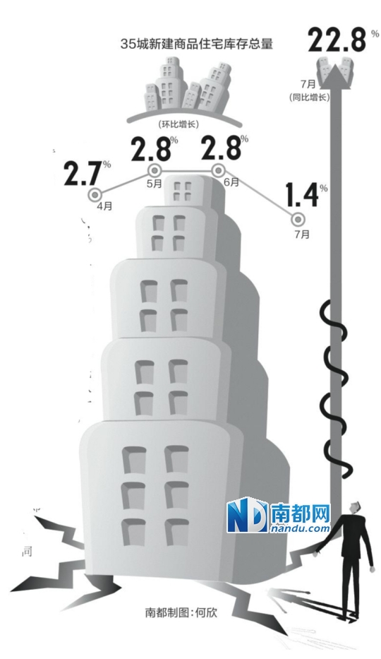 根据易居房地产研究院统计,截至7月底,35个城市新建商品住宅库存总量环比增长1 .4 %,同比增长22.8%。但值得注意的是,在此前4-6月份,35个城市库存环比增幅分别为2.7%、2.8%和2.8%,而7月份库存环比增幅有所收窄。