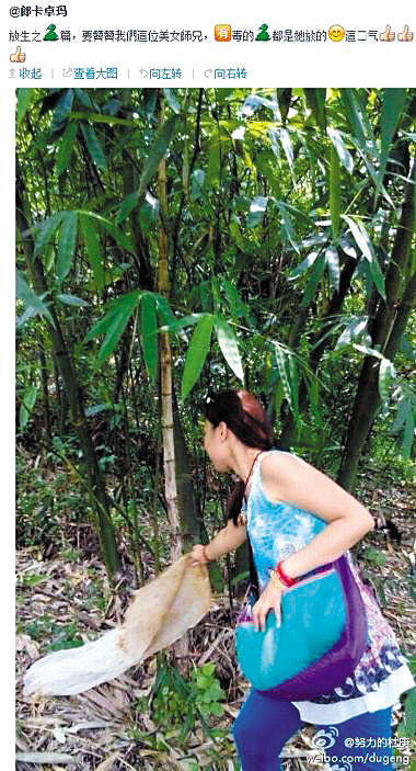 这条引发风暴的微博其实发于7月14日下午,配图为9张放生蛇的画面,其中一名面容姣好的女子将一个装有貌似眼镜蛇、响尾蛇等毒蛇的袋子打开倒进竹林,女子放生后露出笑容。配文写“放生之蛇篇,要赞赞我们这位美女师兄,有毒的蛇都是她放的。这勇气(大拇指)。”
