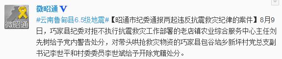 人民网北京8月12日电 据云南省昭通市人民政府新闻办公室官方微博消息,8月9日,巧家县纪委对拒不执行抗震救灾工作部署的老店镇农业综合服务中心主任刘先树给予党内警告处分,对带头哄抢救灾物资的巧家县包谷垴乡新坪村党总支副书记李世平和村委委员李世斌给予开除党籍处分。