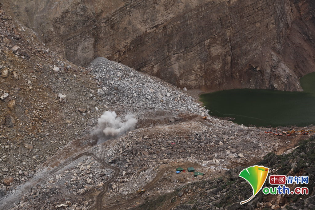 2014年8月12日,云南省鲁甸县地震灾区,水电部队官兵为堰塞湖坝体泄流槽完成最后一次解爆。