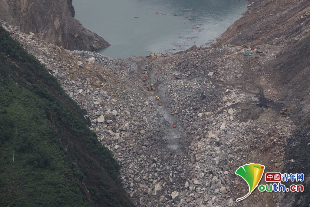云南鲁甸牛栏江红石岩堰塞湖泄流槽挖掘完成