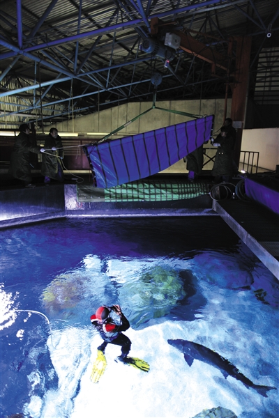 2012年12月,北京海洋馆,工作人员正准备将中华鲟爸爸放入水池。当日,接受人工繁育的中华鲟父母携子从湖北荆州回京定居。新京报记者 浦峰 摄