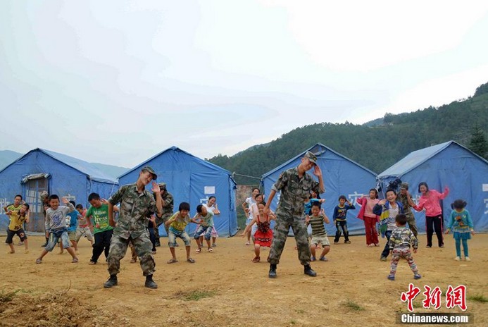 “你是我的小呀小苹果,怎么爱你都不嫌多,红红的小脸儿温暖我的心窝,点亮我生命的火,火火火火火。”为帮灾区孩子走出地震阴影,连日来,解放军陆军第十三集团军红军师炮兵团官兵在巧家县新店镇震区教小朋友跳小苹果。图为解放军教灾区小朋友跳“小苹果”。于炜彬 摄