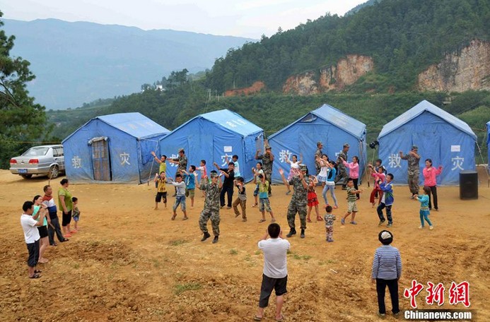“你是我的小呀小苹果,怎么爱你都不嫌多,红红的小脸儿温暖我的心窝,点亮我生命的火,火火火火火。”为帮灾区孩子走出地震阴影,连日来,解放军陆军第十三集团军红军师炮兵团官兵在巧家县新店镇震区教小朋友跳小苹果。图为解放军教灾区小朋友跳“小苹果”。于炜彬 摄