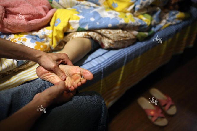 每天晚上,刘霆都会坚持为母亲按摩脚底,减少排异的痛苦。在刘霆眼里,照顾母亲和性别特征是没有关系的。