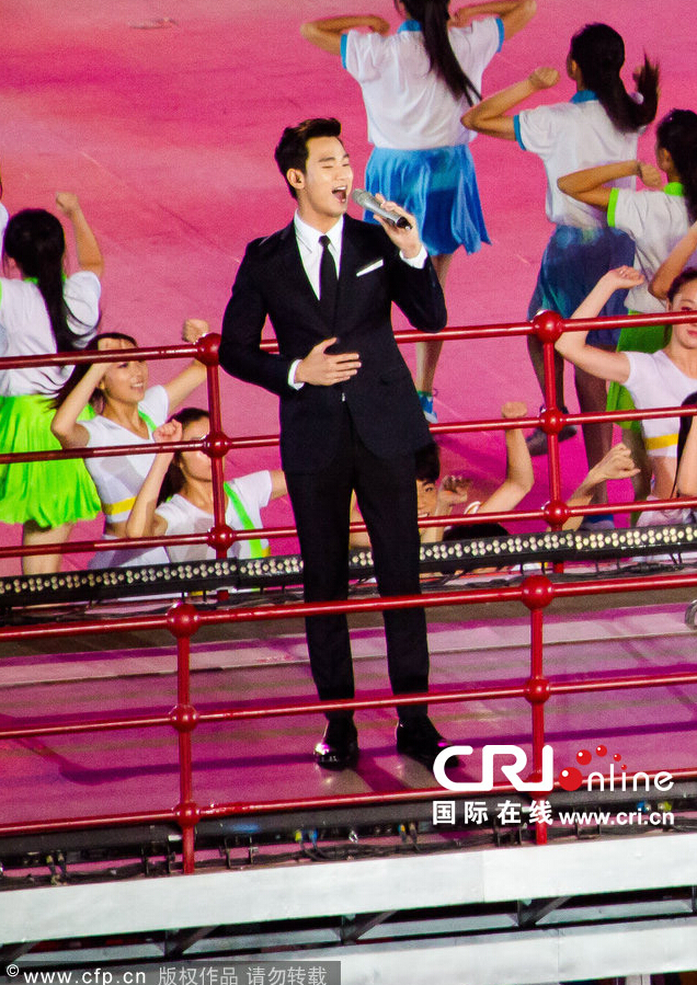 近日,韩国明星金秀贤参加南京青奥开幕式彩排。金秀贤西装革履与张靓颖同台献唱。