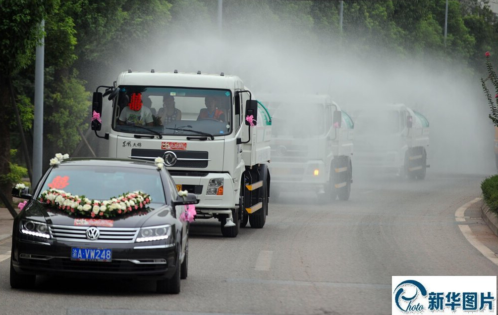 2014年8月15日,重庆,一对新人结婚用12辆环卫车洒水迎亲。浩浩荡荡的婚车队伍。