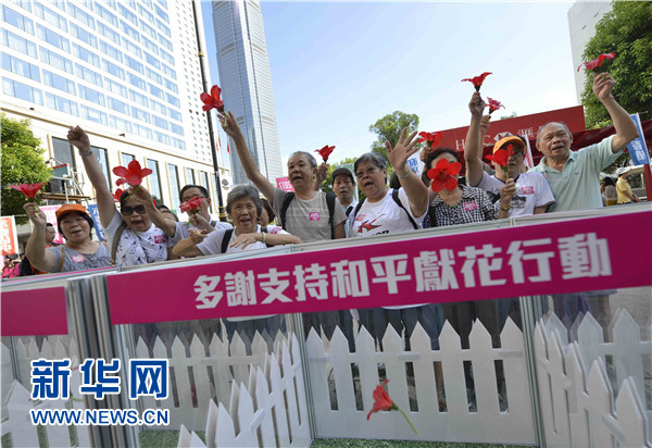8月17日,市民在中环参加支持和平献花行动。新华社记者 吕小炜 摄