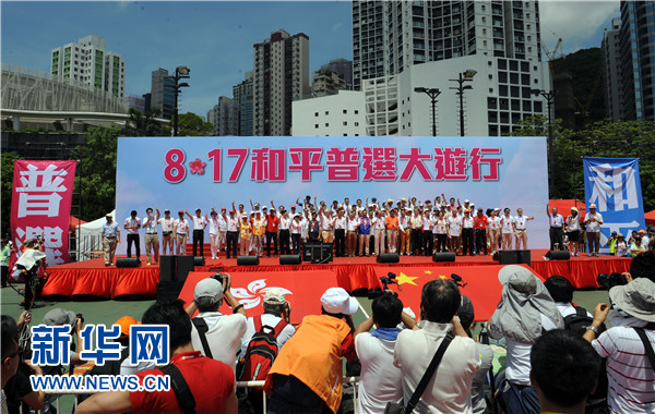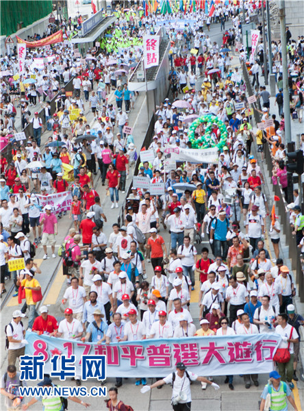 新华网香港8月17日电(记者牛琪 张晶)17日下午,在超过30摄氏度高温下,香港社会各界逾19万人参加了由“保普选、反占中”大联盟发起的“和平普选大游行”,表达各界落实“一国两制”方针和基本法,依法实行普选的愿望和诉求。