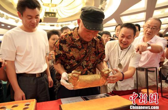 8月17日,一款“唐代开元年黄金鸳鸯枕”在上海“瓷友艺术金融联盟”成立大会上展示,吸引众人竞相争睹珍宝风采,甚至有人戴上手套提一下,测试其重量。潘索菲摄。据了解,该“黄金鸳鸯枕”实重36.1公斤,采用当时最先进的“银熔法”精炼而成,珍贵无比。