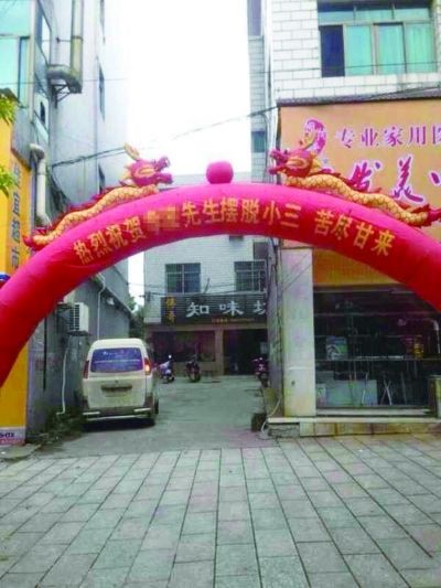“热烈庆祝××先生摆脱小三,苦尽甘来。”8月17日下午,长沙市宁乡县城一家酒楼前,搭了这样一个奇葩的庆贺拱门。