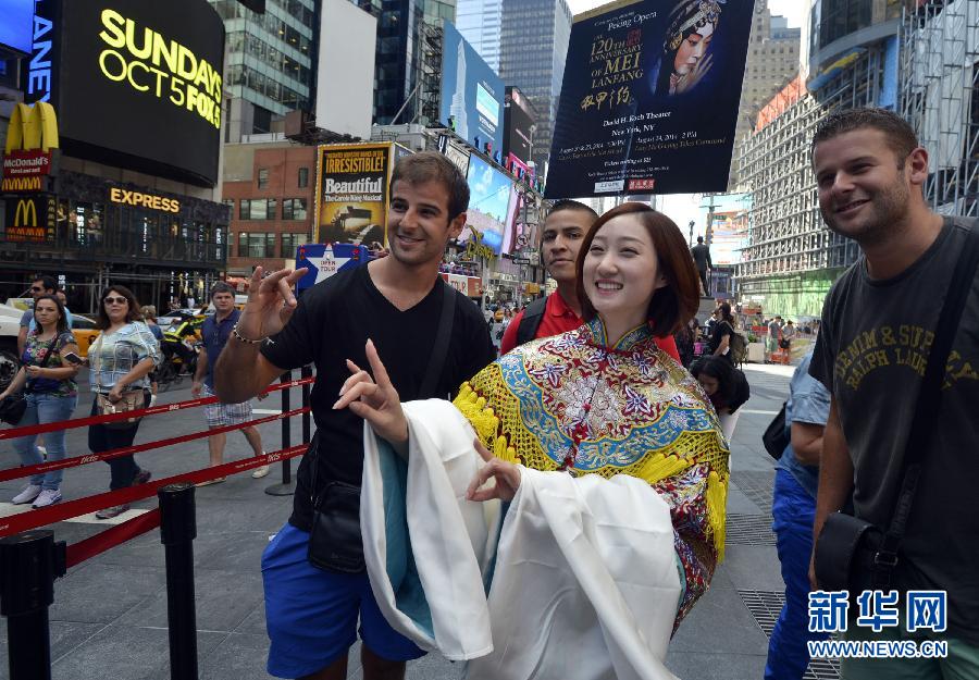 8月19日,北京京剧院梅兰芳京剧团青年演员窦晓璇在纽约时报广场与游客互动交流推介京剧艺术。