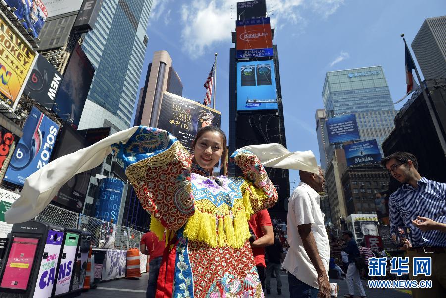 8月19日,北京京剧院梅兰芳京剧团青年演员王梦婷在纽约时报广场身着戏服向游客推介京剧艺术。