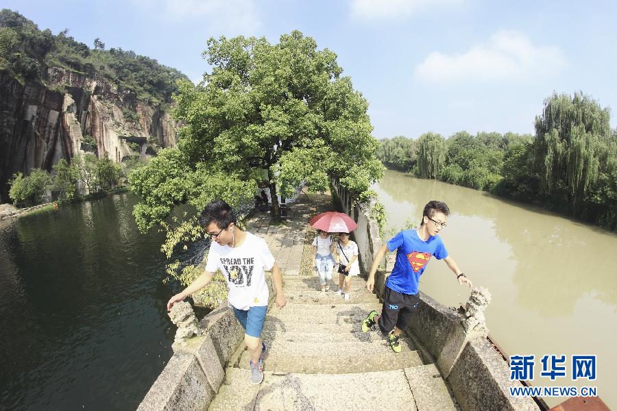 8月21日,游客在浙江绍兴东湖风景区内观看“阴阳河”景观。受连续降雨影响,位于浙江绍兴的浙东古运河中夹带了大量泥沙,呈现浑浊的黄色,而紧邻古运河的东湖水依然清澈,形成了独特的“阴阳河”景观。新华社发(李瑞昌 摄)