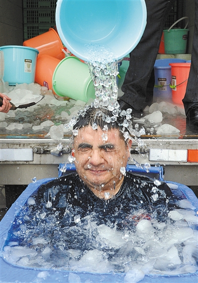 根据主持人的解说,陈光标在冰桶中泡了30分钟,先后有30多桶冰水倾倒在他身上。