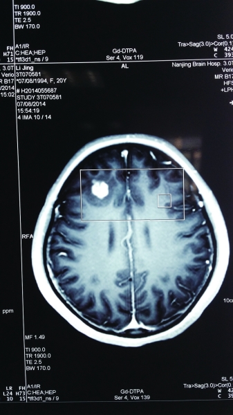 CT扫描显示,小静脑中高亮处疑是寄生虫。
