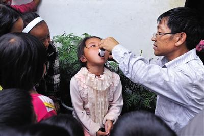 熊朝贵给发烧的孩子喂药。么龙村没有卫生所,孩子们生病熊朝贵就根据情况给药,无法控制的,再送十几里外的卫生院。