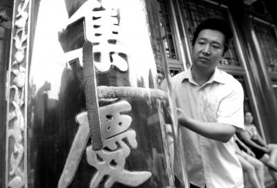 为此,园务队创新发明了楹联除尘器,解决楹联?;ふ帜诓嗷疚薹ㄇ謇淼奈侍?。楹联除尘器为弧形工字结构,一端为26cm的除尘擦头,另一端为12cm的手柄,中间是弧长55cm的弧形连接杆,与抱联形成相同的弧度,使除尘器整体紧贴于抱联内侧扇面,达到伸入内部清理的目的。