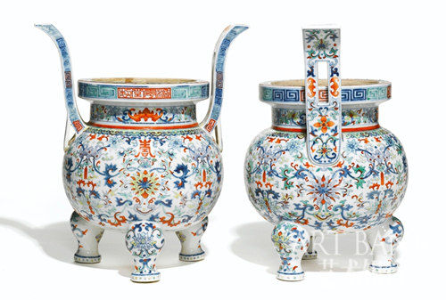 清道光 粉彩番莲福寿纹朝官耳 三足炉 一对 ( 香港苏富比)